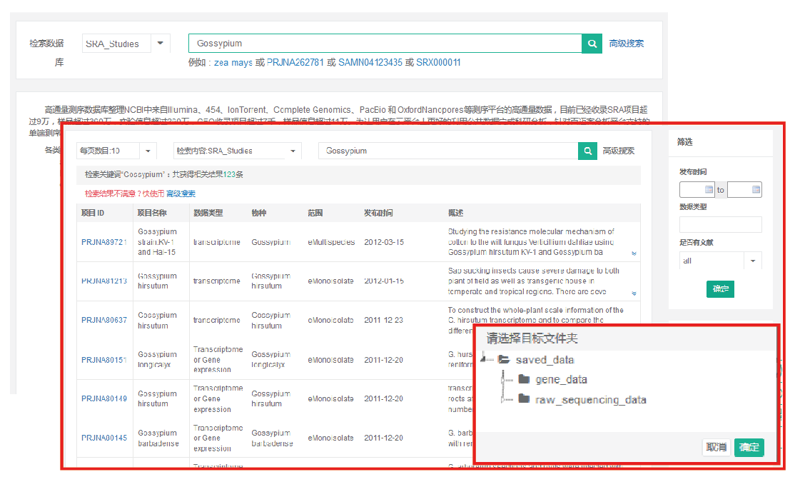 2)搜集SRA數(shù)據(jù)庫(kù)中,棉屬轉(zhuǎn)錄組數(shù)據(jù),共搜集得到154個(gè)來(lái)源于illumina平臺(tái)的棉屬轉(zhuǎn)錄組數(shù)據(jù)。BMKCloud公共數(shù)據(jù)模塊數(shù)據(jù)搜集過(guò)程:進(jìn)入平臺(tái)公共數(shù)據(jù)模塊,輸入關(guān)鍵詞“Gossypium”,并按SRA項(xiàng)目編號(hào)進(jìn)行檢索,使用數(shù)據(jù)類(lèi)型“transcriptome”進(jìn)行過(guò)濾,最終得到104個(gè)項(xiàng)目數(shù)據(jù),可根據(jù)數(shù)據(jù)來(lái)源平臺(tái)在進(jìn)行進(jìn)一步手動(dòng)過(guò)濾,最后一鍵保存數(shù)據(jù)至用戶(hù)賬號(hào)用于后續(xù)分析