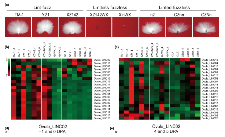 2)結(jié)果發(fā)現(xiàn),編號(hào)為L(zhǎng)INC02在開(kāi)花期0天左右轉(zhuǎn)錄水平在lint纖維正常發(fā)育株中顯著高于lint纖維缺失株;在開(kāi)花期5天左右轉(zhuǎn)錄水平fuzz纖維正常發(fā)育株中顯著高于fuzz纖維缺失株;而上述兩個(gè)時(shí)間點(diǎn)分別為兩種棉纖維起始(initiation)時(shí)間點(diǎn),因此,文章認(rèn)為編號(hào)為L(zhǎng)INC02的lncRNA與棉纖維的initiation有關(guān)
