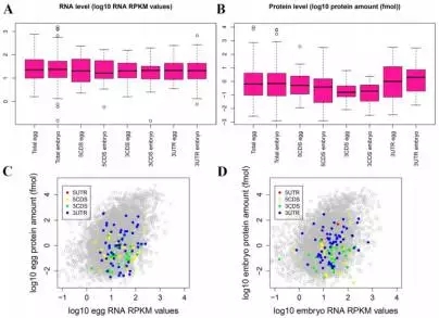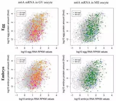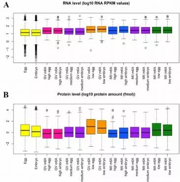 為了探索mRNAs甲基化是否與翻譯有關,作者把mRNA甲基化數(shù)據與Smits等人已發(fā)表的轉錄組和蛋白組數(shù)據進行了整合。通過BLAST分析,在RNA/蛋白數(shù)據中找到了723個m6A修飾mRNAs的信息。GV期或者MII期卵母細胞中高m6A峰的RNA水平(log10 RNA RPKM值)比總RNA高(在卵或者胚胎中),但是蛋白水平(log10 protein amount / fmol)比總蛋白水平低(Figure 2)。與高度甲基化的mRNAs相比,低甲基化RNAs顯示出非常高的表達水平(Figure 3)。這些結果說明在卵母細胞或早期胚胎中,m6A修飾可能與mRNA翻譯有關。