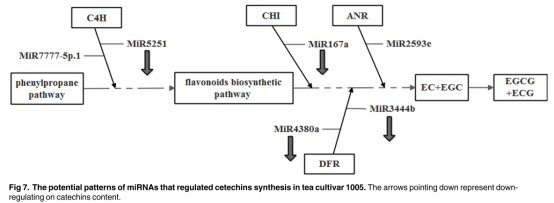 茶樹(shù)(Camellia sinensis),富含兒茶素,是風(fēng)靡全球的非酒精飲料之一。兒茶素是茶葉中重要的組成部分,包括脂型兒茶素(如:ECG和EGCG)和非脂型兒茶素(如:EC和EGC)。EGCG是茶葉中含量最豐富的兒茶素并且具有較強(qiáng)的抗癌效果,可以制約癌細(xì)胞的生長(zhǎng),抑制雄激素受體的功能并調(diào)控癌細(xì)胞的生存,血管的生成和移動(dòng)。基于他們的分子構(gòu)成,兒茶素可以分為簡(jiǎn)單兒茶素和脂型兒茶素。在兒茶素的合成過(guò)程中有許多酶的參與,如查耳酮合酶(CHS),查爾酮異構(gòu)酶(CHI),黃烷酮醇4-還原酶(DFR),花青素合酶(ANS),花青素還原酶(ANR)和類黃酮3,5羥基化酶(F3’5’H)。MiRNA被鑒定為轉(zhuǎn)錄和轉(zhuǎn)錄后水平基因表達(dá)的重要調(diào)節(jié)因子,并且裂解目標(biāo)mRNA是植物中基因表達(dá)的主要調(diào)控方式。