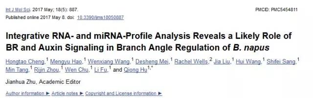 題目:mRNA-miRNA整合分析揭示BR、auxin信號(hào)通路參與調(diào)控油菜分蘗(分枝)角度