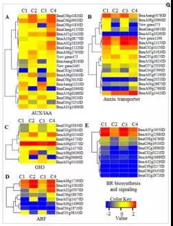 e)圖4展示了在BR生物合成、BR信號(hào)轉(zhuǎn)導(dǎo)通路、auxin信號(hào)轉(zhuǎn)導(dǎo)通路上鑒定到的差異表達(dá)基因。這些差異基因中,BR6OX調(diào)控了BR生物合成過程中multiple C-6C的氧化過程;DWRF1催化24-methylenecholesterol轉(zhuǎn)化為campesterol,該過程為BR生物合成的第一步;分布在BR信號(hào)轉(zhuǎn)導(dǎo)通路上的差異基因包括 BRI1, BSK, BZR1, and CYCD3等, 這些基因多在品系 Purler中下調(diào) (見圖 5E);分布在 auxin 信號(hào)轉(zhuǎn)導(dǎo)通路上的基因包括 AUX1, IAA, GH3, ARF等,其中 IAAs, GH3s, ?ARFs 在兩個(gè)時(shí)間點(diǎn)的 Purler品系材料中均表現(xiàn)為上調(diào)。