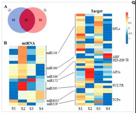 大部分的miRNA與其對(duì)應(yīng)的靶基因在表達(dá)量上均呈負(fù)相關(guān),比如, miR156 在Purler品系中轉(zhuǎn)錄上調(diào), 其對(duì)應(yīng)的大部分的 靶向 SPL 基因在Purler品系中表現(xiàn)為下調(diào); ?miR395 與miR319 在Purler品系中轉(zhuǎn)錄上調(diào) ,其對(duì)應(yīng)的靶基因包括 Sulfate Transporter (SULT) 、TEOSINTE-BRANCHED/CYCLOIDEA/PCF (TCP)表現(xiàn)為相反的趨勢(shì),這些結(jié)果說明,本研究中的mRNA-seq、microRNA-seq結(jié)果均比較可靠。轉(zhuǎn)錄水平表現(xiàn)為相反趨勢(shì)的的miRNA-gene 可用于后期進(jìn)一步更加深入的挖掘油菜分枝背后的microRNA-mRNA調(diào)控網(wǎng)絡(luò)。