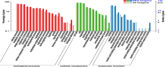 GO分類(lèi)中大多數(shù)DEGs聚類(lèi)到細(xì)胞過(guò)程(61.97%),繁殖過(guò)程(15.49%),結(jié)合過(guò)程(42.96%)(圖5)。