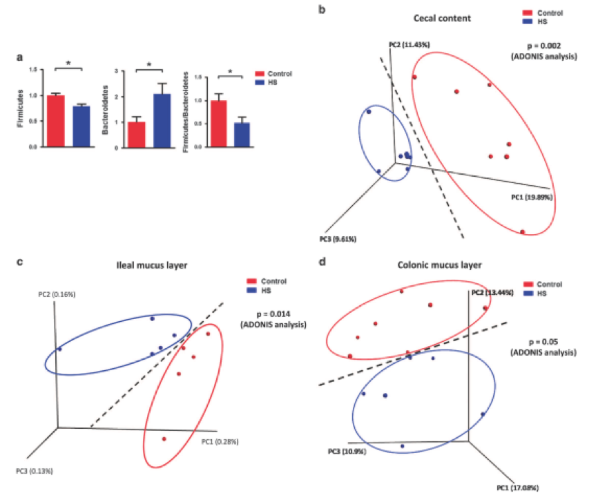 為了研究HS攝入如何影響腸道微環(huán)境,研究人員將HS組的細(xì)菌組成與對照組相比,在HS處理后,盲腸中Actinobacteria,F(xiàn)irmicutes和Bacteroidetes在門水平和Actinobacteria以及Clostridia和Bacteroidia的百分比顯著不同。unweighted uniFrac分析結(jié)果顯示HS和對照組分別聚集(圖2b)。進(jìn)一步分析顯示,HS和對照組在回腸粘液層分別聚集(圖2c),而對照組和HS組形成兩個(gè)聚類,分離趨勢明顯在結(jié)腸粘液層(圖2d)。研究結(jié)果表明,慢性HS喂養(yǎng)可能導(dǎo)致腸道生態(tài)失調(diào),細(xì)菌計(jì)數(shù)和微環(huán)境組成的變化也證明了這一點(diǎn)。
